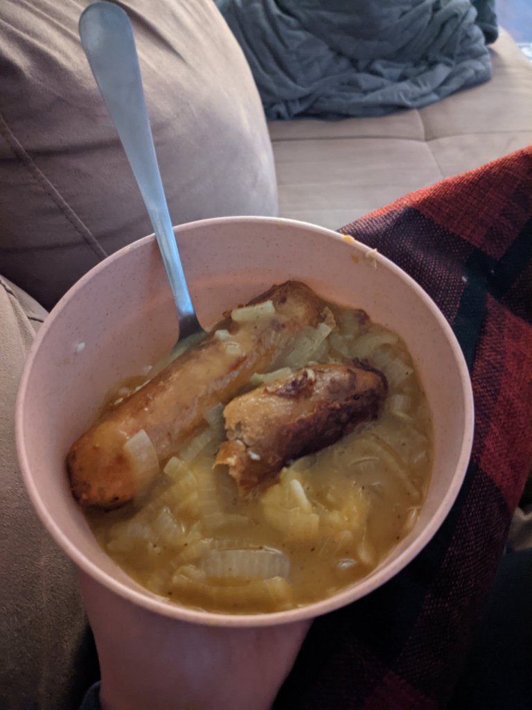 To end the night, I made bangers and mash with a whiskey onion gravy. Fake sausage for me and real sausage for Paul. We watched some HGTV because when we were in Ireland that was our favorite thing to watch in the hotel rooms at night. The Irish version of HGTV shows are way better than our version.